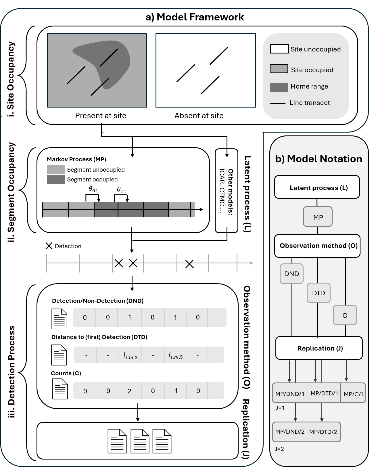 Line transect surveys, fixed paths along which observers record detections of animals or signs of their presence, are a core tool in ecological monitoring. In occupancy studies, line transect surveys are used to determine species’ presence/absence whilst accounting for imperfect detection and varying availability for detection along the transect. However, which research questions can be answered using such surveys depends on how detections are recorded, ranging from binary presence/absence in transect segments to continuous-time detections. These differing data collection protocols give rise to structurally distinct statistical models, with varying identifiability properties and inferential performance. In this paper, we present the first comprehensive comparison of commonly used line transect occupancy models within a unified framework, structured around data collection design, model formulation, parameter identifiability, and practical performance. Using algebraic analysis and data cloning, we show that widely used models are often either non-identifiable or not practically identifiable. We develop a novel, data-based diagnostic to detect this issue in applied settings. An extensive simulation study illustrates the practical implications of data-collection approaches, model choice, and corresponding inference. We make recommendations regarding choice of detection protocol and line transect survey design and demonstrate the real-world consequences of these findings using a case study on leopards in the Zambesi-Transfrontier Conservation Area in Central Africa. Our results offer methodological innovation and actionable guidance for ecologists and statisticians.